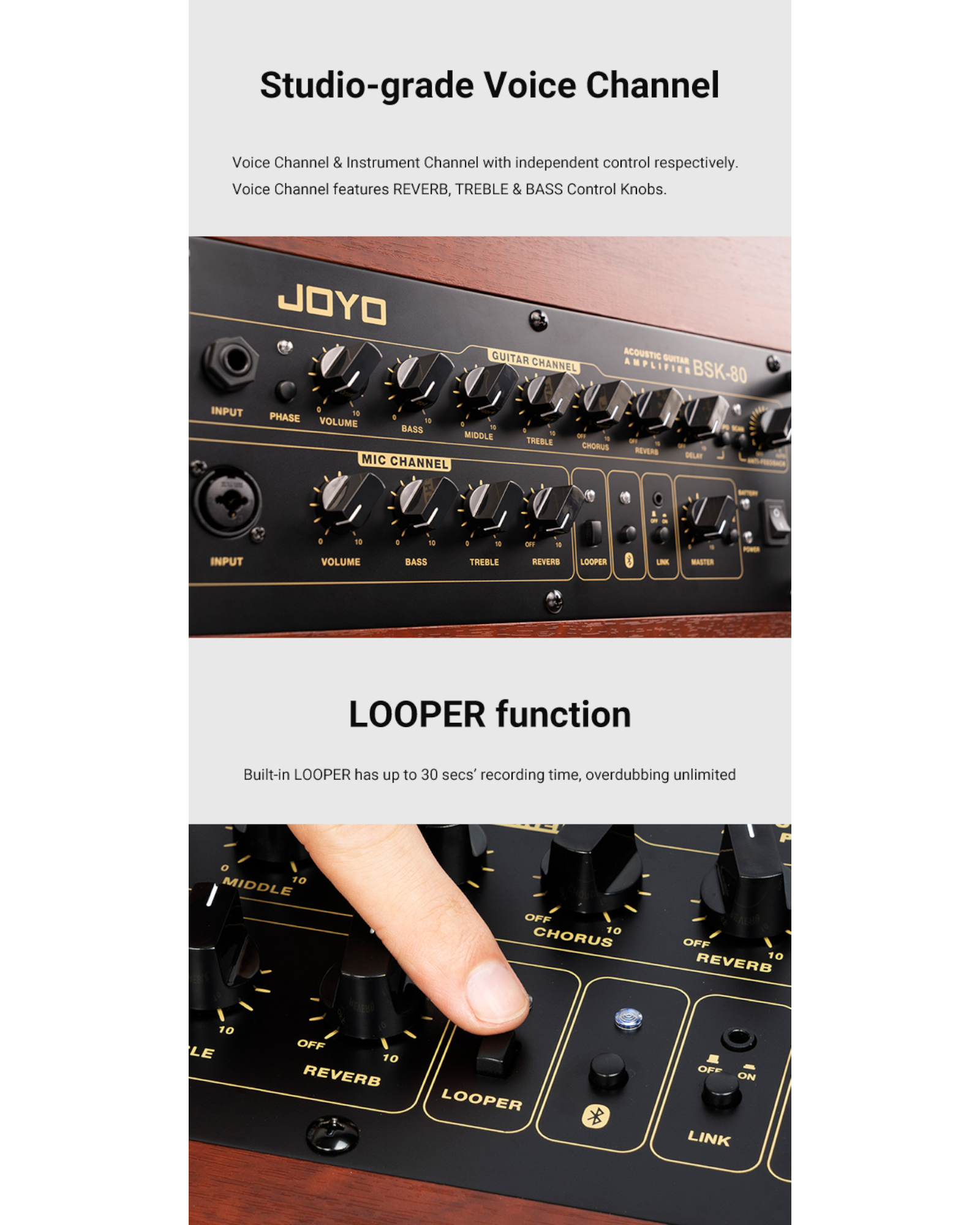 Built-in DSP Effects: The Joyo BSK-80 boasts a high-performance DSP chip that provides multiple simultaneous digital effects, including Chorus, Delay, Reverb, and Anti-Feedback. Perfect for enhancing your acoustic guitar or vocal sound on the fly.