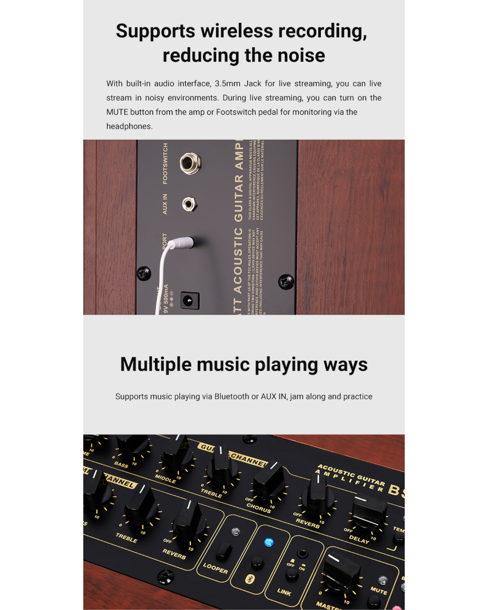 Inputs: Guitar / Microphone / AUX IN / LINE IN / Bluetooth