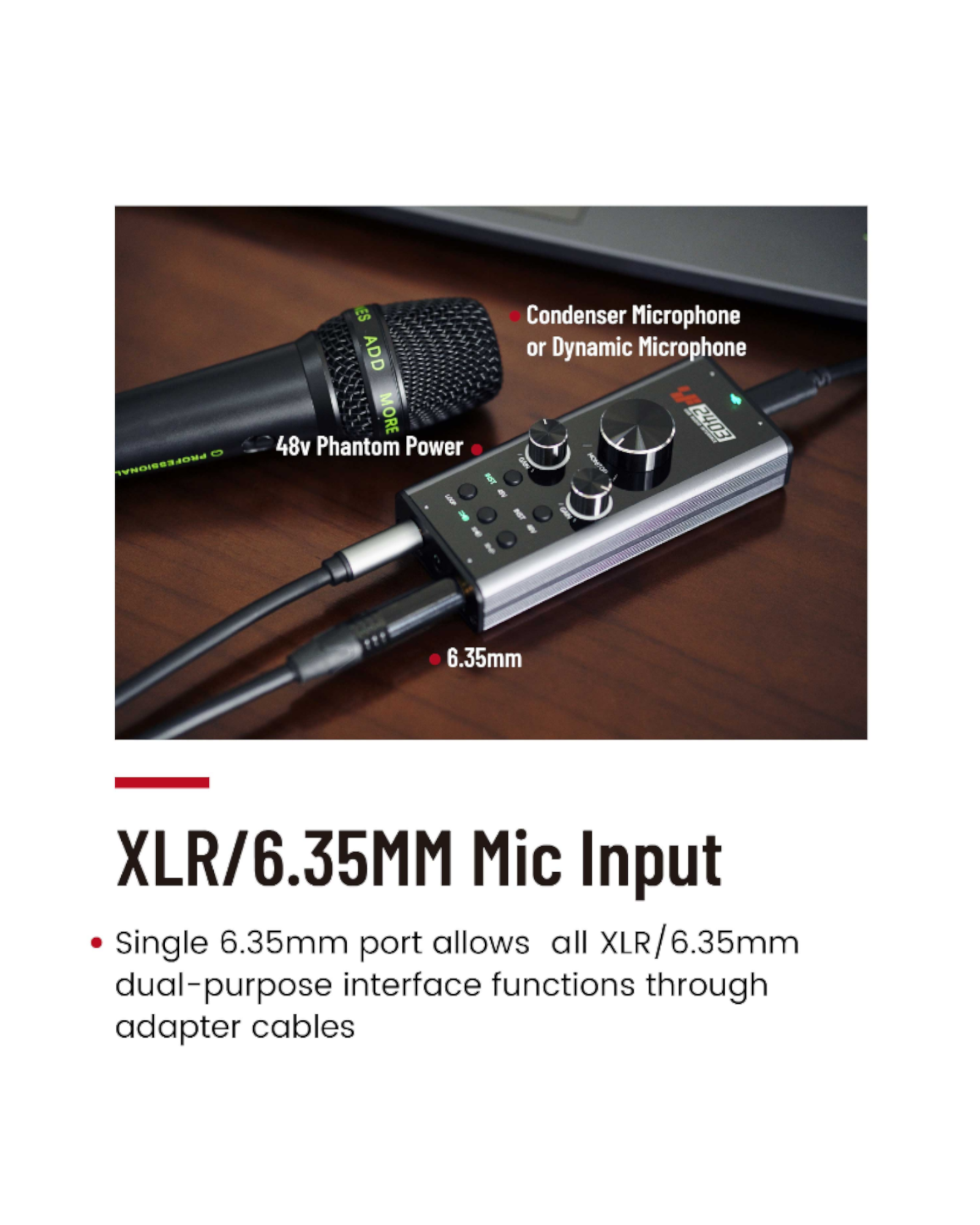 Dual Input Channels: Includes two 6.35mm TRS input interfaces, allowing simultaneous connection of microphones, instruments, or balanced audio inputs. Both channels offer individual gain knobs for precise adjustments.