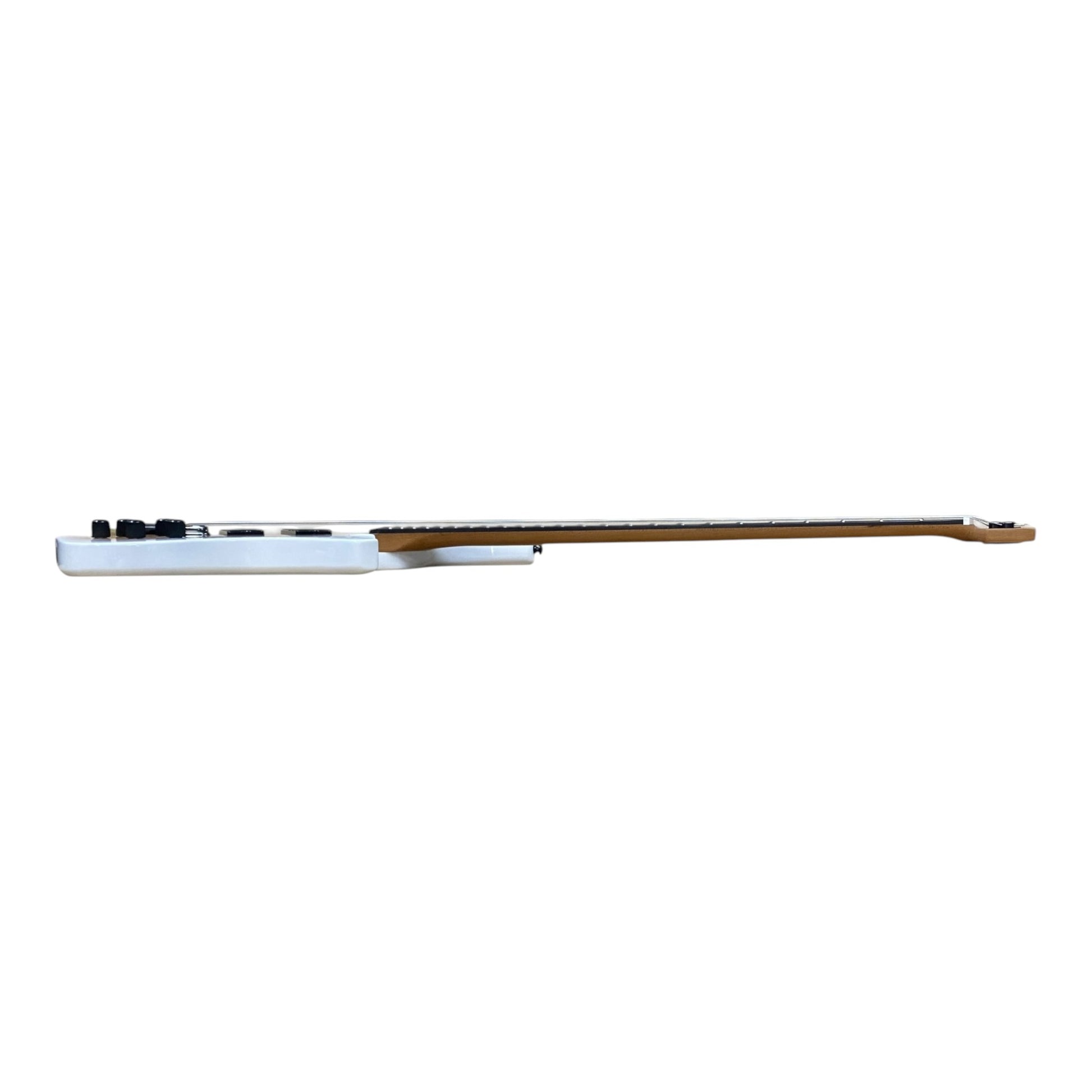 Featuring a scale length of 838 to 889mm and a nut width of 49.75mm, this bass guitar is designed for maximum comfort and versatility. The black hardware finish and black machine heads and end pin/strap complement the white sunburst with a printed veneer finish, giving this bass guitar a striking and distinctive look.